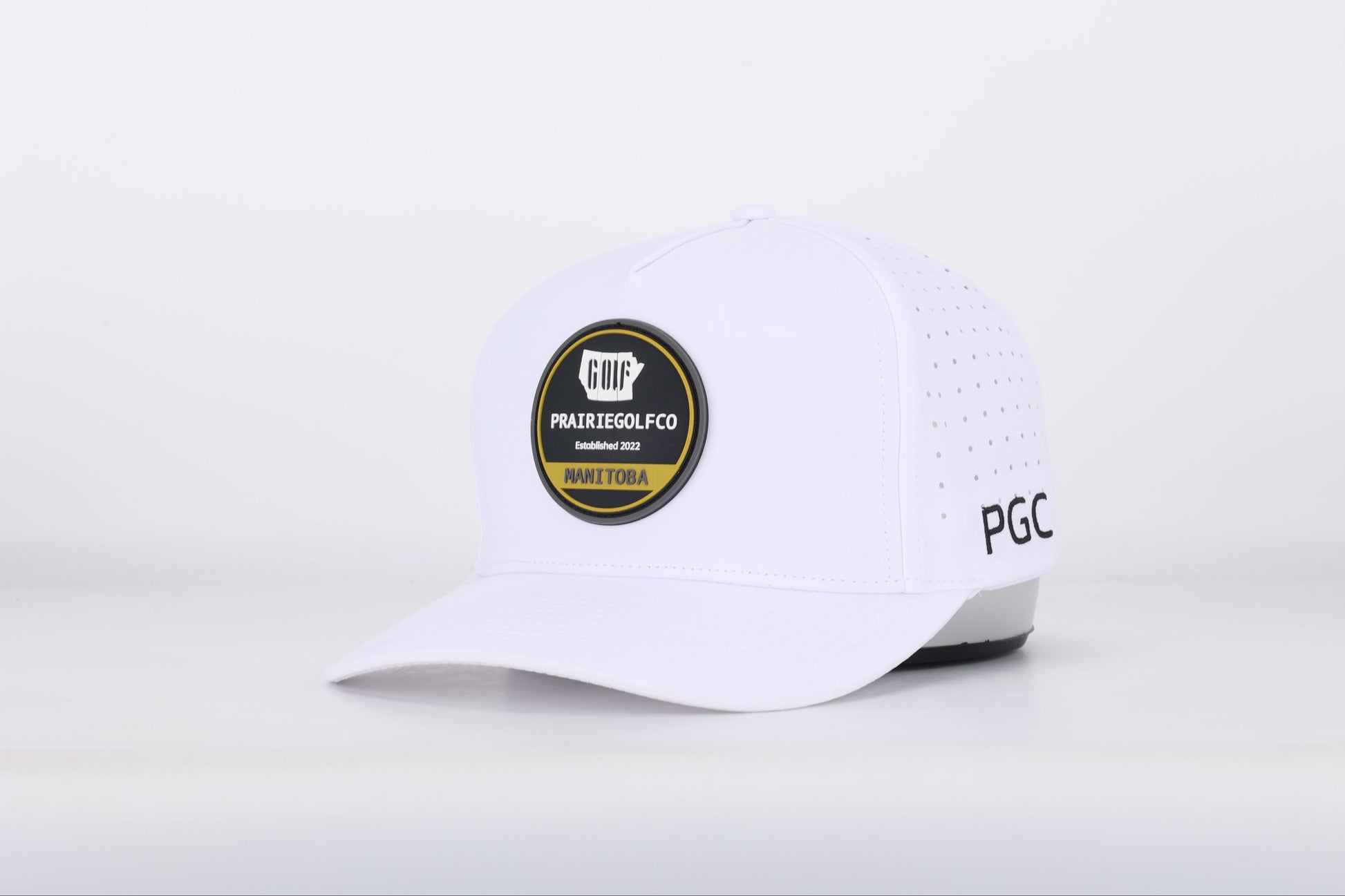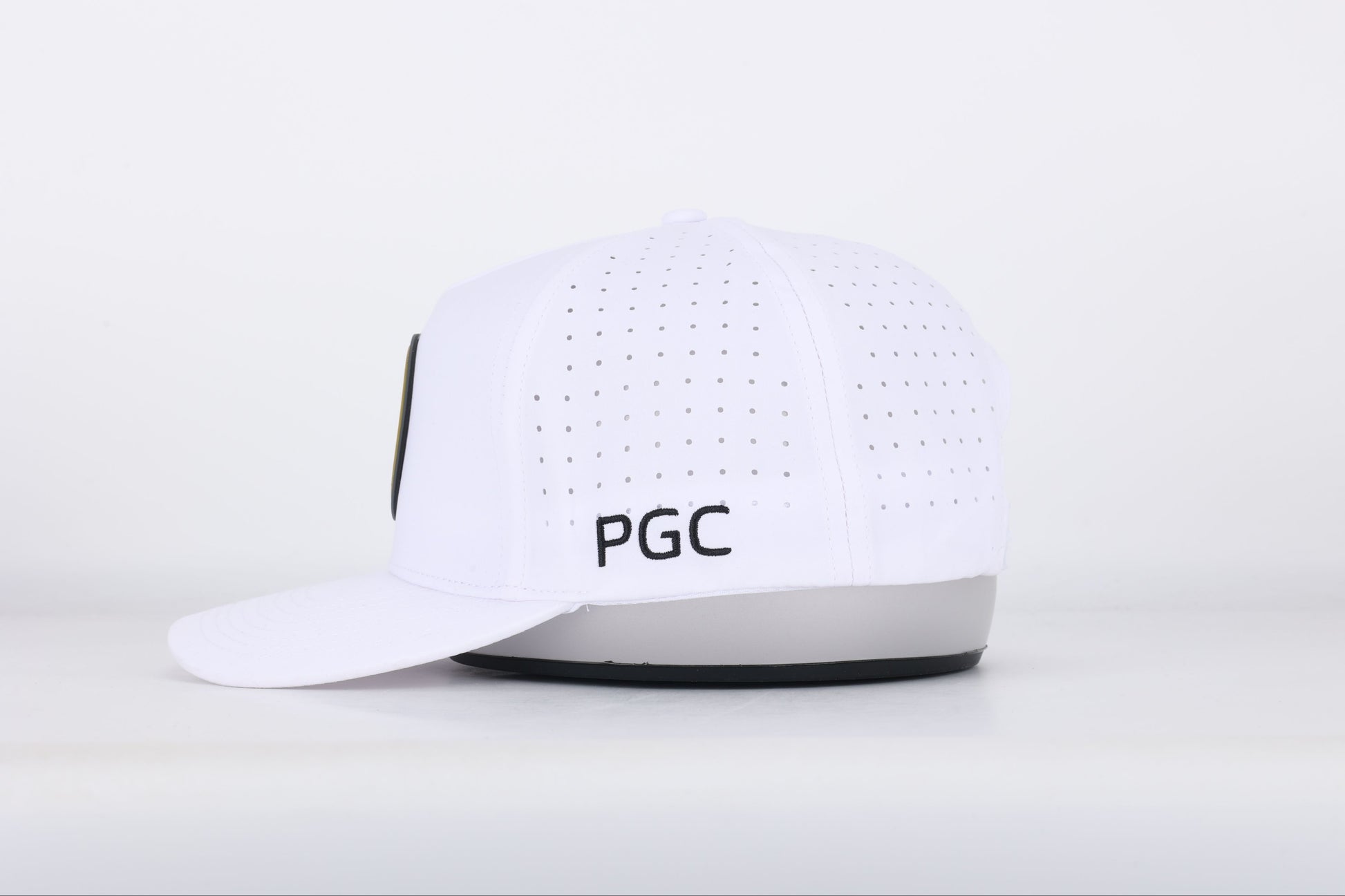 The polyester / spandex blend along with laser cut holes make this hat extremly breathable, more sweat resistant, and easy to wash. This hat also features a water resistance coating which makes it perfect for those rainy day rounds. Oh, and its feels and fits as good as it looks.